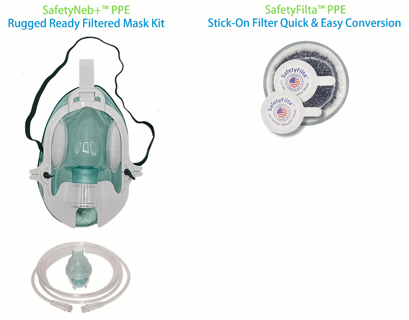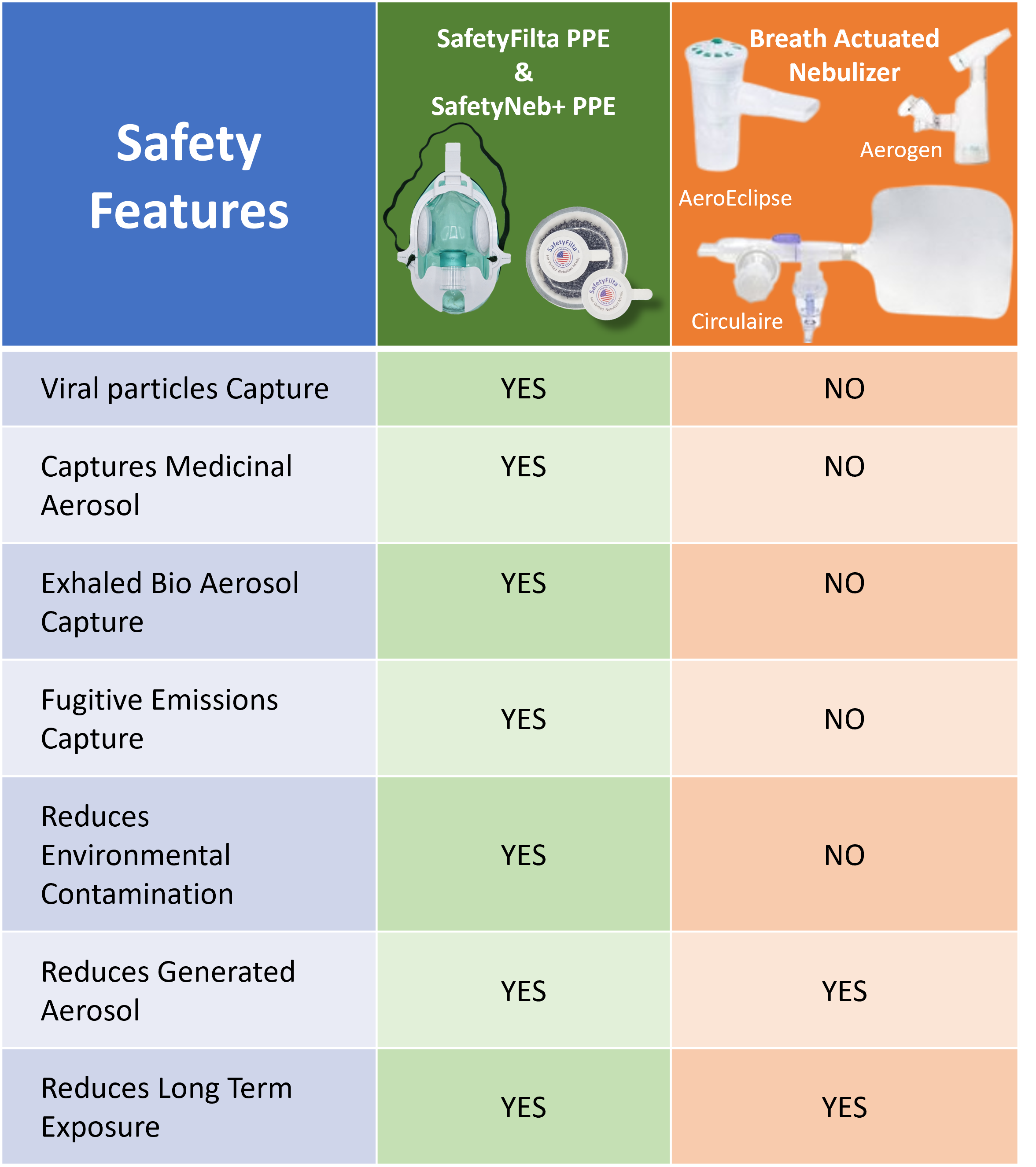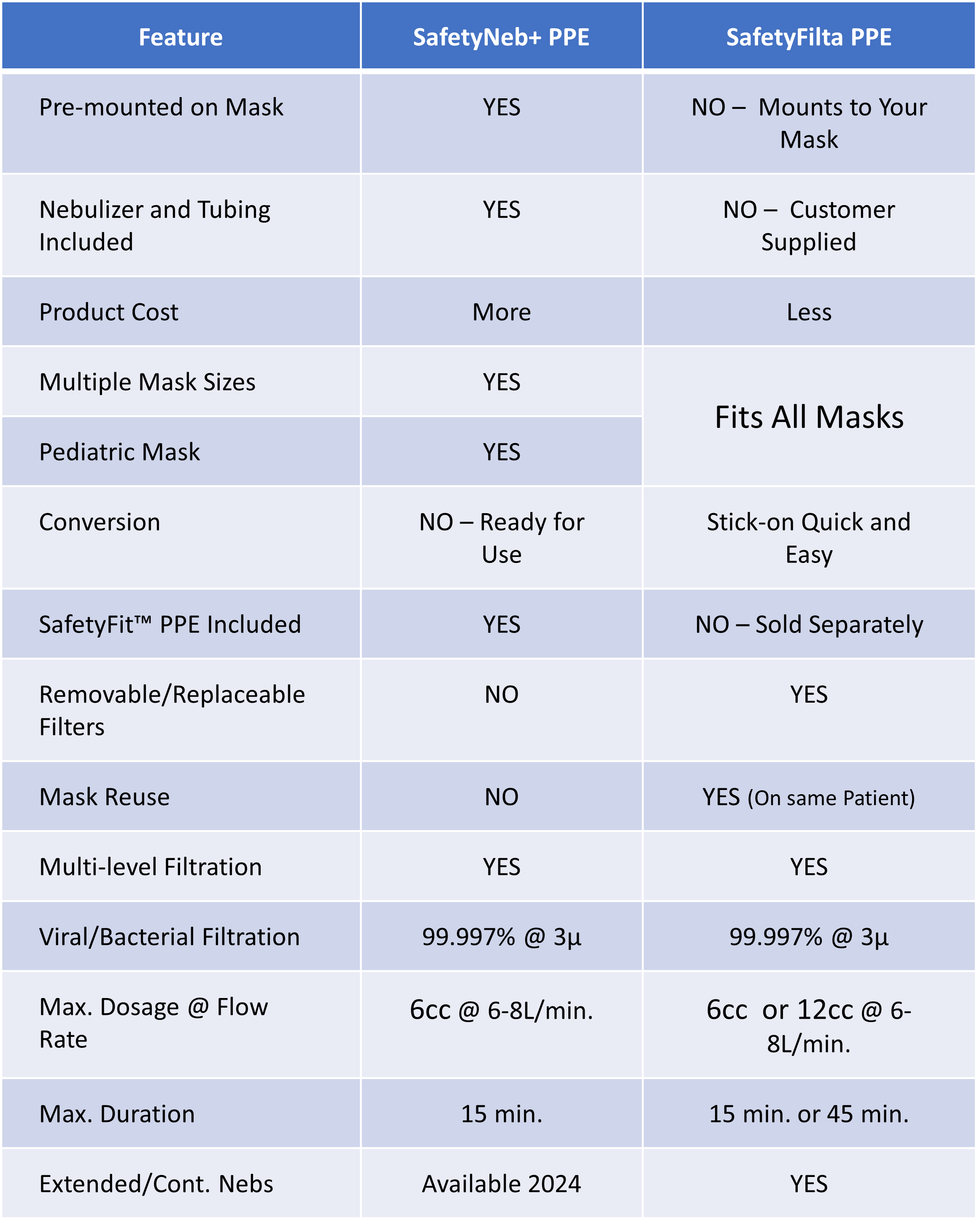 As the nebulizer generated aerosol is captured by the filtration media (in protection of surrounding environment) it also leads to saturation of the filtration media. Over time the saturation increases in air flow resistance through the filtration media which is detrimental to the patient. All things being equal, larger filtration media last longer than smaller filtration media. That is why there is an upper limit on the time a filtration system can be utilized. When the filters are fixed to the mask -- such as with the SafetyNeb+™ PPE -- the mask must be discarded once this limit is reached. In the SafetyFilta™ PPE configuration, once the limit is reached the filters can be removed and replaced with fresh SafetyFilta™ PPE to extend the mask use on the same patient. For operational purposes, a single SafetyFilta™ PPE filter is equal in size to the two SafetyNeb+™ PPE mounted filters.Features Comparison