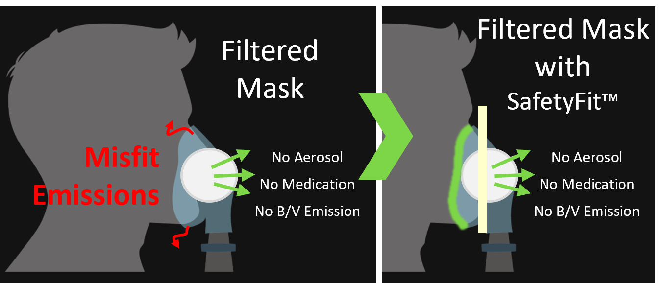 The SafetyFit™ adjustable faceplate works in conjunction with the SafetyFilta™ device to further reduce aerosol emissions. By conforming your standard respiratory masks to face contours, the SafetyFit™ adjustable faceplate improves mask fit thereby reducing potential contour gap misfit emission microleakage. The SafetyFit™ device works with any size mask to create a CPAP-like seal to the patient's face.