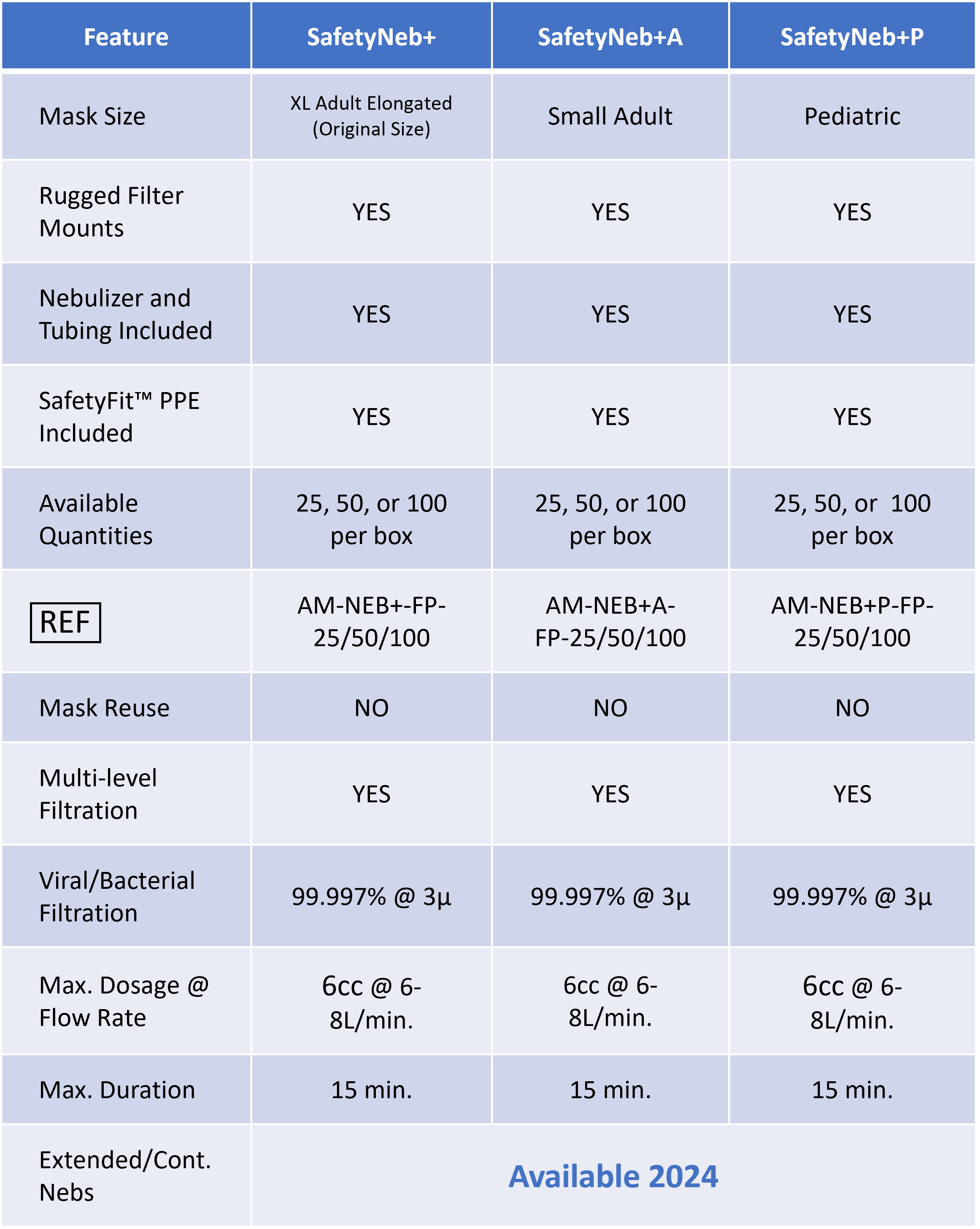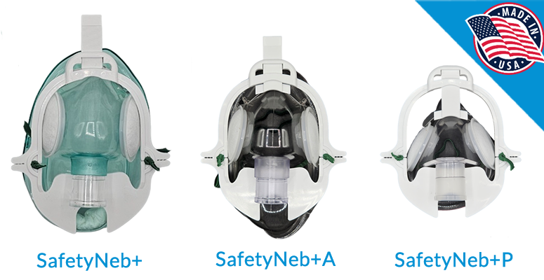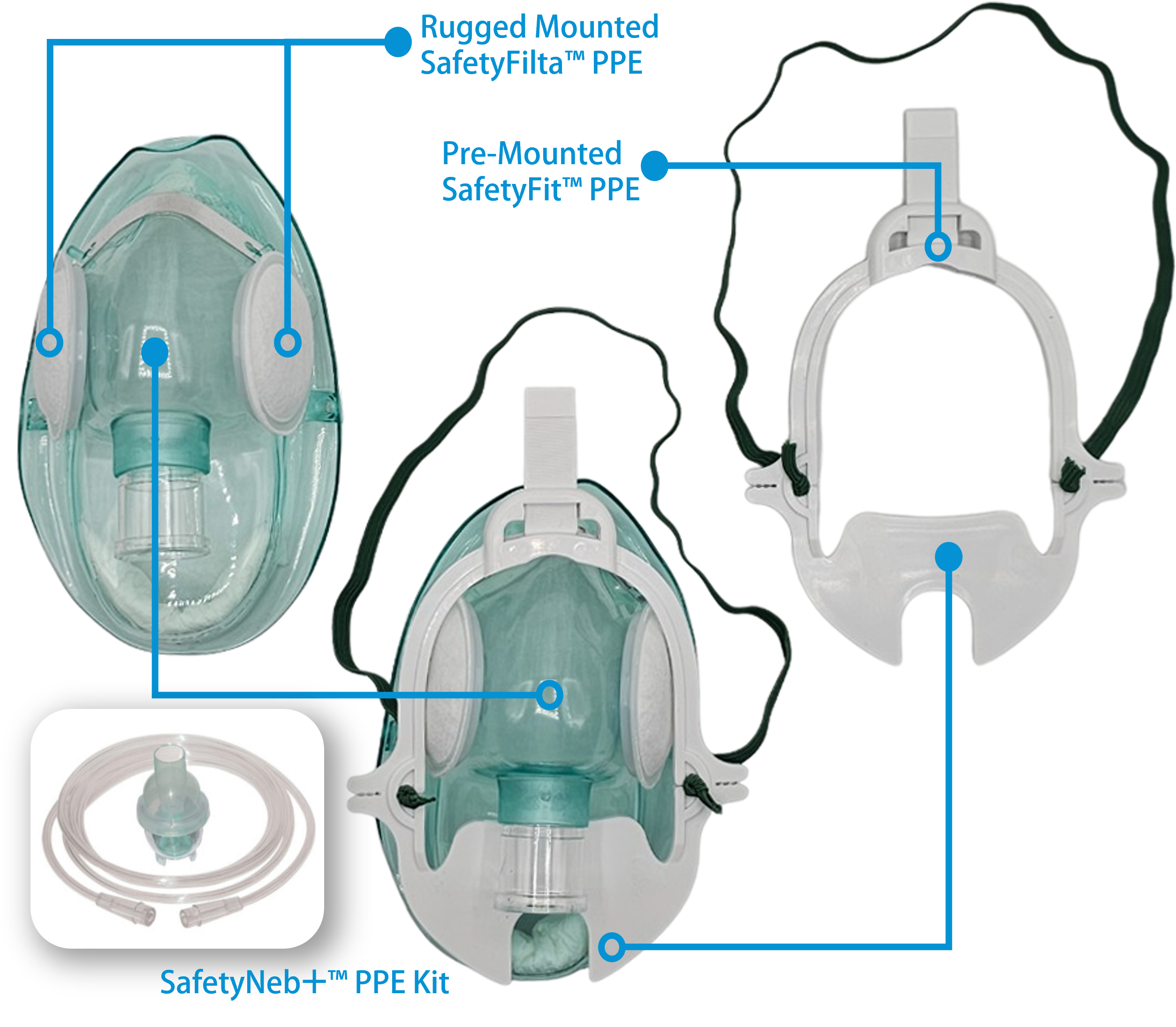 Our standard SafetyNeb+™ kits include the pre-assembled filtered mask, the SafetyFit™ faceplate, plus a nebulizer and tubing. Contact us for kit options without tubing.